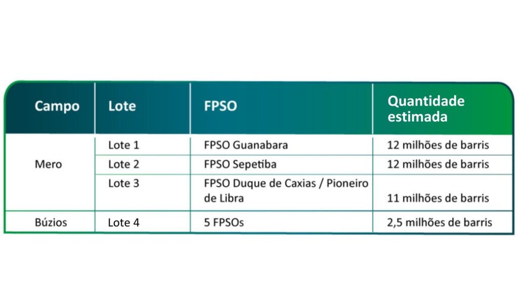 Serão comercializados 37,5 milhões de barris de petróleo, divididos em três lotes do campo de Mero e um de Búzios. Os volumes são as melhores estimativas da parcela de petróleo da União em 2025 nestes campos, que contemplam as incertezas inerentes ao processo. Isso significa que, ao arrematar um lote, o comprador terá disponível todas as cargas nomeadas em 2025, ainda que o montante total seja maior ou menor ao volume estipulado no edital.