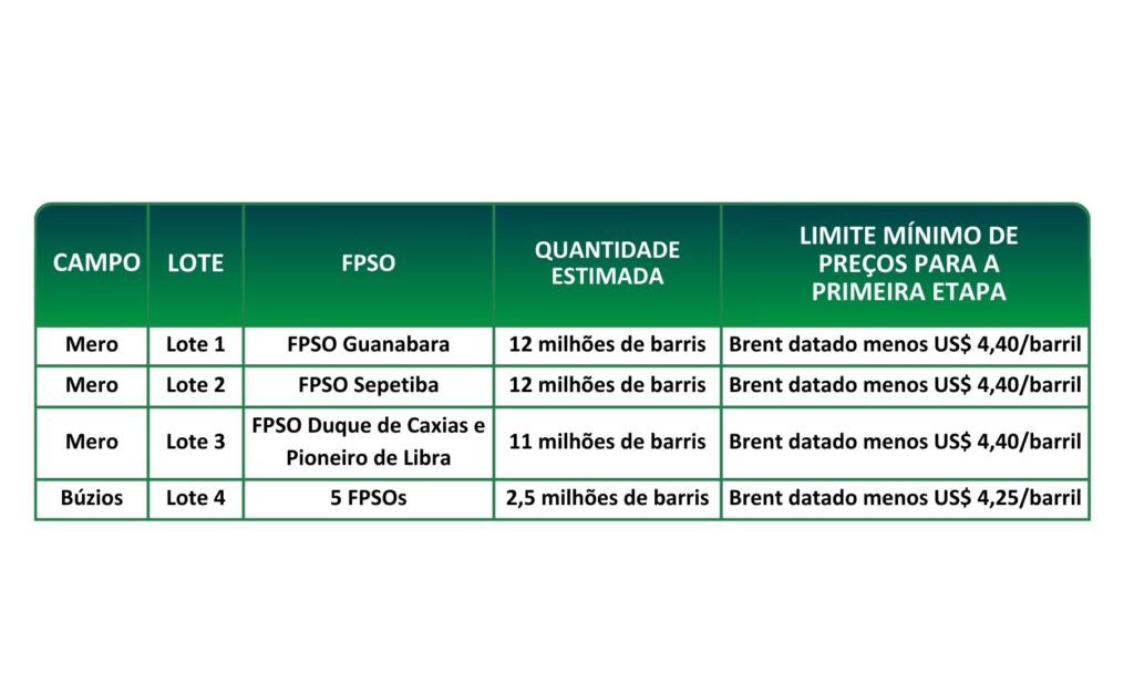 A PPSA estabeleceu um Limite Mínimo de Preços para cada lote para a primeira etapa do leilão. O limite mínimo da primeira etapa para os lotes de Mero será igual ao valor do Brent datado menos US$ 4,40/barril, enquanto o limite mínimo da primeira etapa do lote de Búzios será igual ao valor do Brent datado menos US$ 4,25/barril.