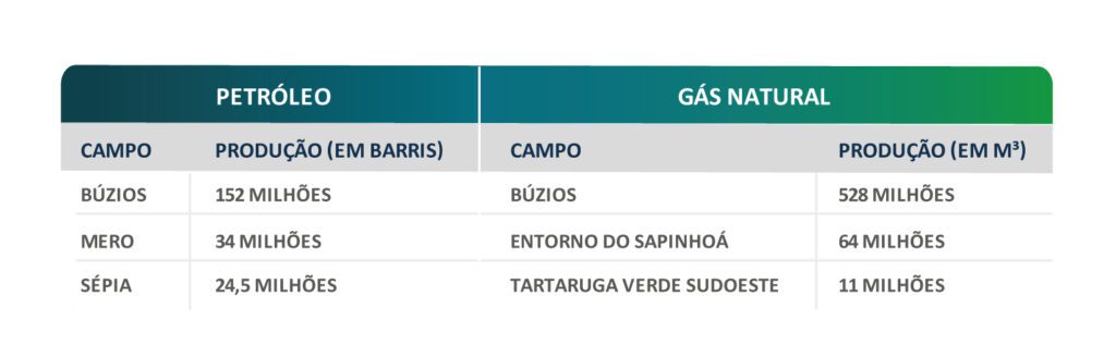 Os campos de Búzios e Mero foram os principais produtores em 2022, com 152 milhões e 34 milhões de barris de petróleo, respectivamente. Juntos, responderam por 80% da produção total. Quando analisada a parcela da União, os dois campos também foram os que mais contribuíram, respondendo por 74% da produção.